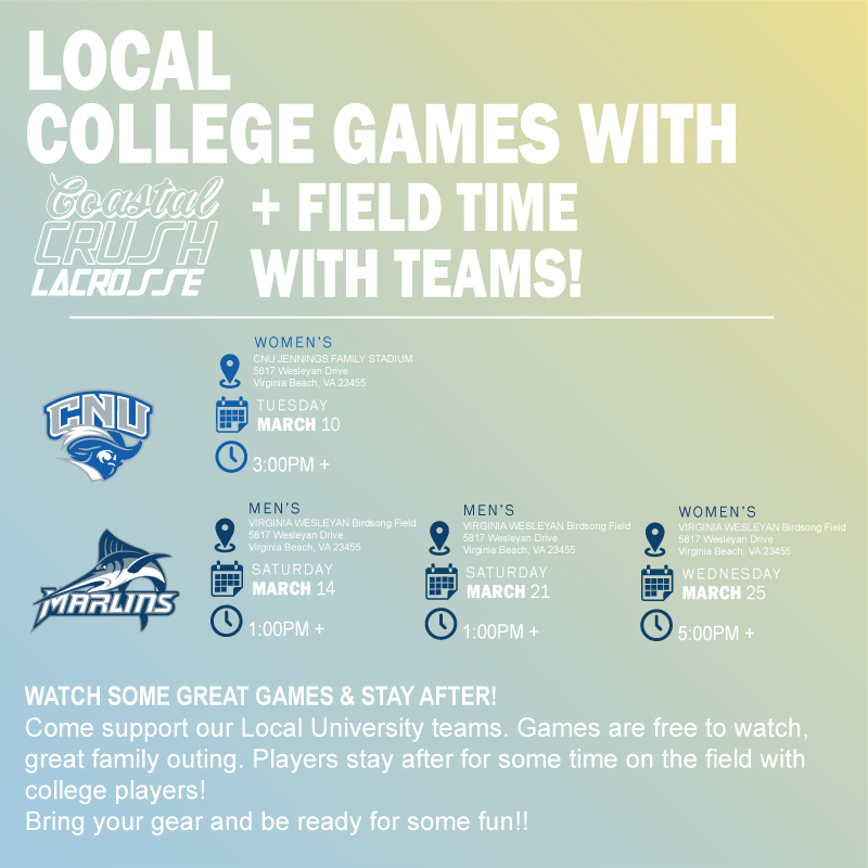 Coastal Crush Lacrosse offers player development clinics all over Hampton Roads throughout the year. Clinics are often offered in conjunction with US Lacrosse and local university coaches and players. With the goal of making the game of lacrosse inclusive in our region, we try to keep our clinic costs low, or free when possible.